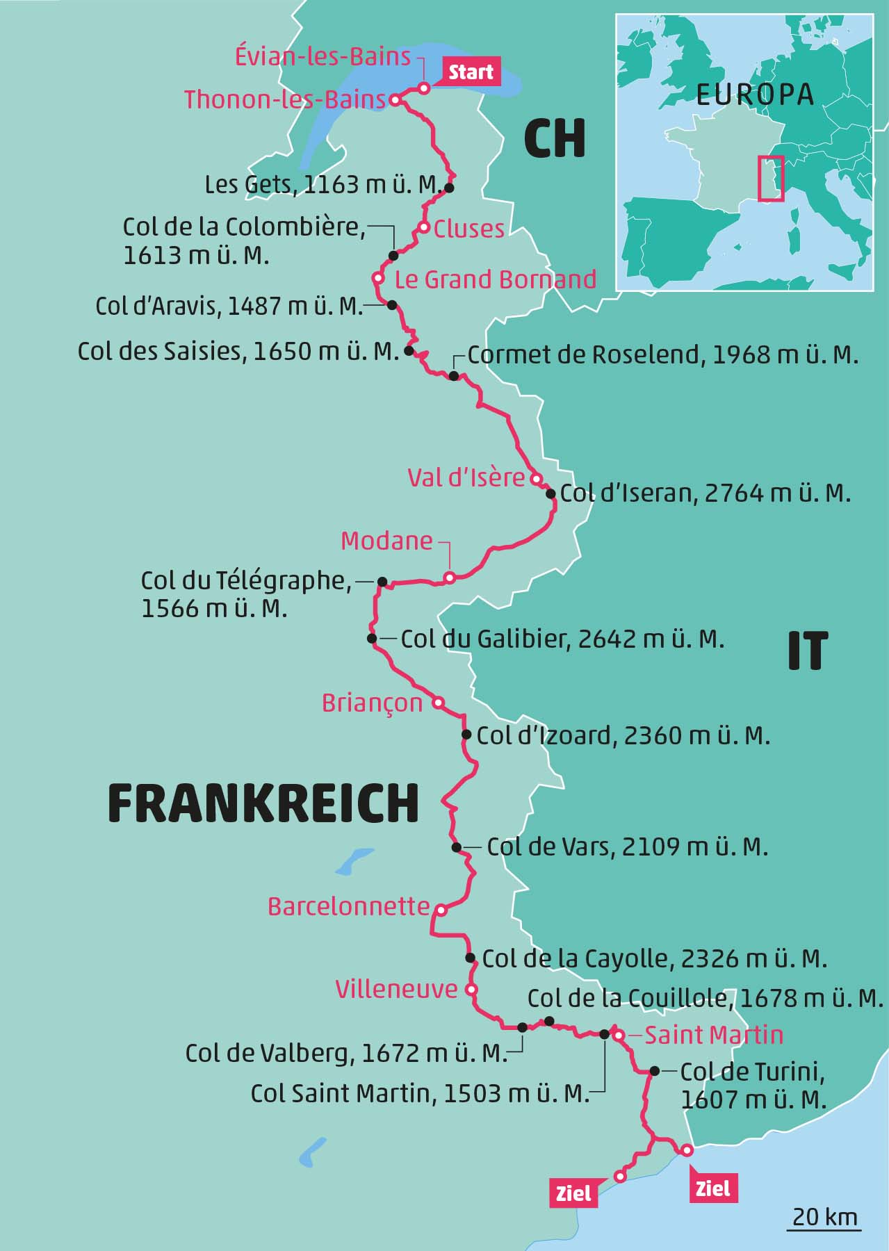 Ob es wirklich 15 Pässe sind, kann allerdings nicht schlüssig beantwortet werden. Wenn die paar kleineren Pässchen mit dazu gerechnet werden, kommt man auf eine höhere Zahl. Wer möchte, kann die Alpe d’Huez oder den imposanten Col de la Bonette einbauen. Wir halten uns an die Originalroute.