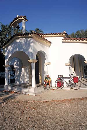 Auf Evia herrscht eine andere Zeit. Die Dörfer sind ruhig, auf den Strassen fahren kaum Autos, die Grillen zirpen lauter als auf dem Festland, der Wald duftet nach Harz. Vor einem Kafenion in Istiéa bleibt Odysseus sitzen, döst in die Sonne hinein. Er sitzt eine halbe Stunde, eine ganze. Die Sonne ist dem Horizont schon nahe. Odysseus muss noch ein Stück radeln. Er hat keine Ahnung, wo er heute Abend übernachtet, doch das ängstigt ihn nicht im Geringsten. In Prokopi ist eine riesige Wallfahrtskirche. Sie pilgern hierher zum unverwesten Leichnam des heiligen Johannes des Russen. Man kann ihn im Glassarg betrachten, das Kinn, die Unterarme, die Füsse wie aus dunklem Leder. Dabei liegt er schon bald dreihundert Jahre hier. Odysseus braucht ein Nachtlager. Er geht zum Popen, der schickt ihn über den Platz ins Pilgerhaus.