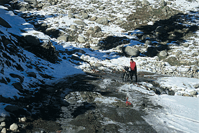 Die Strasse von Tiflis in die Schwarzmeerstadt Batumi ist auf unserer Karte als Hauptstrasse eingezeichnet, doch zeigt sich schnell, dass dies nicht so eng zu verstehen ist. Knietiefe Löcher sind keine Ausnahme, und der Schnee des einsetzenden Winters hat der Schotterstrassse arg zugesetzt. Autos wären im Matsch stecken geblieben, sodass der Abschnitt über den 2025 Meter hohen Goderzipass offiziell gesperrt war. Mit den Velos aber erreichten wir den Pass mehr oder weniger problemlos, obwohl auf den letzten Kilometern Schieben angesagt ist. Wollen wir das nächste Dorf noch vor dem Eindunkeln erreichen, müssen wir uns sputen. Doch das ist gar nicht so einfach. Auf der Schattenseite des Passes verwandelt sich die Strasse in eine einzige Eisbahn, wieder ist Schieben angesagt. Bei einem einsamen Bauernhaus klopfen wir an die Tür und fragen in brüchigem Russisch, ob wir angesichts der einsetzenden Dunkelheit in der Scheune übernachten dürften. Wir dürfen – und wie! Papize Ramaz Isidorowitsch setzt uns als erstes auf den Holzofen, und kaum sind wir aufgetaut, wird der Tisch nach allen Regeln georgischer Gastfreundschaft gedeckt. «Woher seid ihr? Ihr radelt im Winter mit dem Velasipied durch Georgien?» fragen die Knechte, die ganz am Schluss erhalten, was von den Gästen nicht verspeist worden ist, füllen die Wodkagläser und beginnen zu singen. Der Abend ist lang und feuchtfröhlich. Das Zimmer, das wir im oberen Stock erhalten, ist blitzblank wie das ganze Haus. Am Ende dürfen wir keinen einzigen Lari als Dank hier lassen, da kommen uns die Geschenke, die Remo nach Tiflis gebracht hatte, gerade recht: Ansichtskarten aus der Schweiz, eine Packung Fertigfondue und eine Tüte Mailänderli von der Mamma.