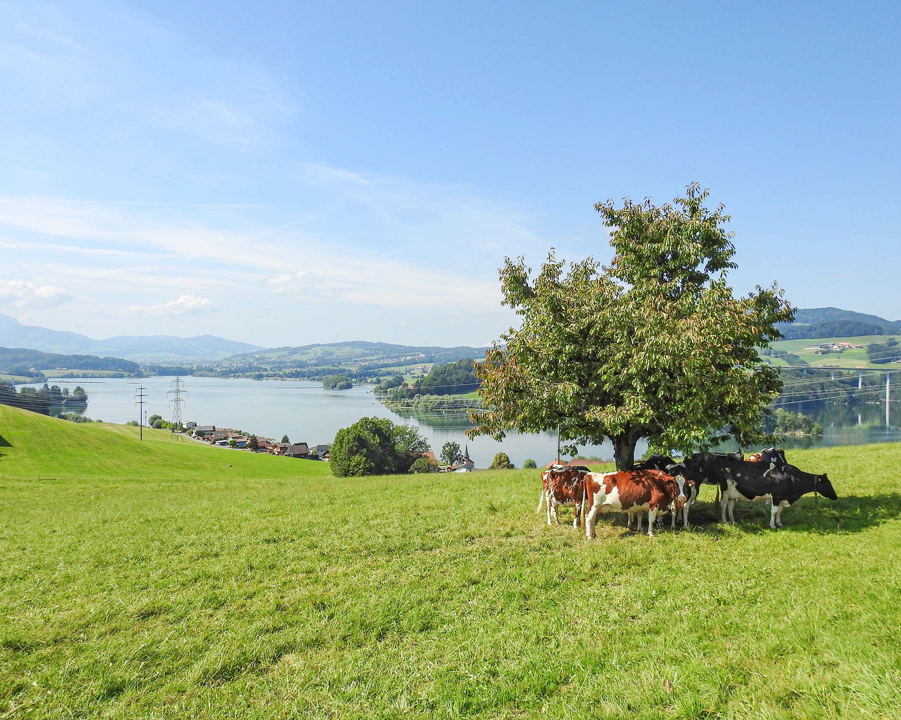 In Corbières geht es rechts ab, eine Brücke überquert an einer schmalen Stelle den Lac de la Gruyère. Der sieht idyllisch-urtümlich aus, ist aber ein Stausee für die Stromproduktion, erst achtzig Jahre alt. Im einfachen Bauerndorf Marsens leuchtet die achteckige Rotonde in den Himmel, wieder so ein imposanter, städtisch anmutender Kirchenbau, den die Jesuiten im 17. Jahrhundert errichtet haben.