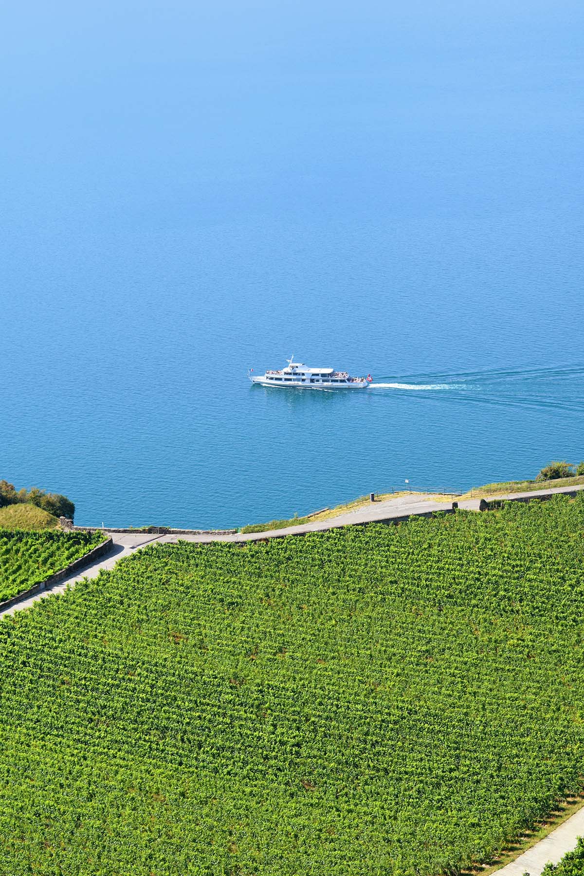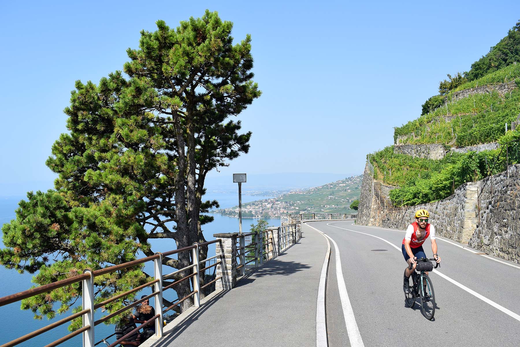 Im offenen Gelände sehen wir links unter uns den Lac de Bret, in der Ferne den Mont Pèlerin. Blickt man geradeaus, zeichnen sich am Horizont die Savoyer Alpen ab, dann erreichen wir bei Montchervet die Kante zum Genfersee. Die Sicht auf das Wasser öffnet sich mit einem Schlag, raubt einem den Atem. Am verrücktesten ist das Bild in Chexbres, nach der Rechtskurve, wo die Lavaux-Höhentrasse beginnt. Da verbinden sich Himmel, Wasser und Rebberge zu einem mächtigen Universum.