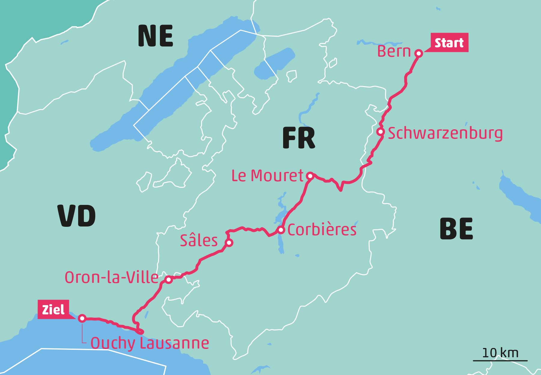Kurzbeschreibung: Die Tour von Bern nach Ouchy Lausanne ist eine hügelige Genussfahrt an wilden und stillen Gewässern, über Weiden und durch Wälder. Je nach Form und Geschmack kann die Reise in zwei oder drei Tage aufgeteilt werden.