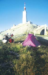 Wir zahlen und machen uns auf den Weg zum Schlimmsten, was einem Radler unter die Räder kommen kann. Kurz nach dem Dorf beginnen die ersten Rampen, und jetzt, am Nachmittag, brennt uns die Sonne direkt auf den Rücken. Schon tropft der Schweiss auf den Lenker. Zum Glück sind wir in guter Gesellschaft. Dutzende von cyclotouristes sind in beiden Richtungen unterwegs. Selbstverständlich grüssen alle, denn man ist ja gemeinsam am grossen Berg. Doch auf der Strasse sind auch ältere Herrschaften mit schwer beladenen Tourenvelos, die sich in den Kopf gesetzt haben, auf dem Gipfel die Windfestigkeit ihrer Zelte auszuprobieren. Die grüsst man mit besonderem Respekt. Jetzt tröpfelt der Schweiss nicht mehr, sondern er fliesst in Strömen. Die Luft flimmert über dem Asphalt. Unendlich langsam kriechen wir den Berg hoch, und an jedem Kilometerstein lesen wir die paar lumpigen Höhenmeter ab, die wir geschafft haben.