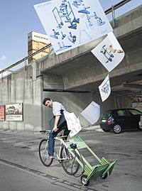 Der Taschenhersteller Freitag verleiht neuerdings auch Fixies: Diese stehen an einer mobilen Servicestation, die zusätzlich mit Pumpe und Werkzeugkiste ausgerüstet ist. Ein Design-Unikat.
