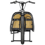 Für grössere Lasten bietet Bergamont das «E-Cargoville LJ 70»: Dieses modulare Lastenrad ist mit Boschs neuem, besonders kraftvollem «Cargo Line»-Motor ausgestattet. Der «Powertube 625»-Akku steckt in der leicht angewinkelten Lenksäule, und bei Bedarf passt ein zweiter Powerpack-Akku ans Sitzrohr. Dank der höher bauenden Kettenstrebe, die zugleich Teil des Hosenschutzes ist, lässt der Hinterbau auch die Montage eines Zahnriemens zu. Dazu passt, dass Bergamont ab Werk die stufenlose Cargo-Nabe von Enviolo verbaut. Die Ladefläche misst 70cm x 45cm und bietet Aufnahmen und Ösen, um verschiedene Boxen und Behälter anbringen. Das maximale Gewicht der Ladung beträgt 90kg, das maximale Systemgewicht 220kg.