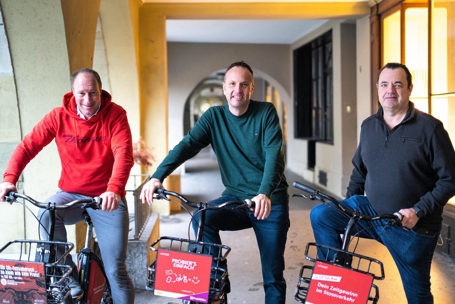 Der bisherige Publibike-CEO Markus Bacher (Mitte) holt mit Thomas Binggeli (links) und Guido Honegger (rechts) zwei Investoren mit spezifischem Fachwissen an Bord. (Foto: ZVG)