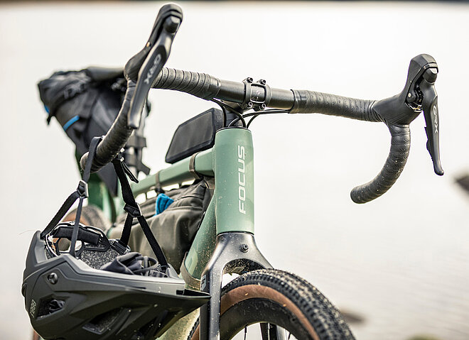 Um Platz für breite Reifen zu schaffen, setzt Focus auf Boost Road-Achsen mit einer Einbaubreite von 148 mm hinten und 110 mm vorne. So passen Reifen der Dimension 700Cx47 in Hinterbau und Gabel. Wer für Abenteuer im Gelände noch breitere Reifen aufziehen will, kann Laufräder der Dimension 650B montieren. Für eine aufgeräumte Optik verschwinden die Züge und Leitungen zudem am Steuerrohr im Rahmen. Dies schafft zusammen mit dem Flare-Rennbügel viel Platz für die Montage einer Lenkertasche.