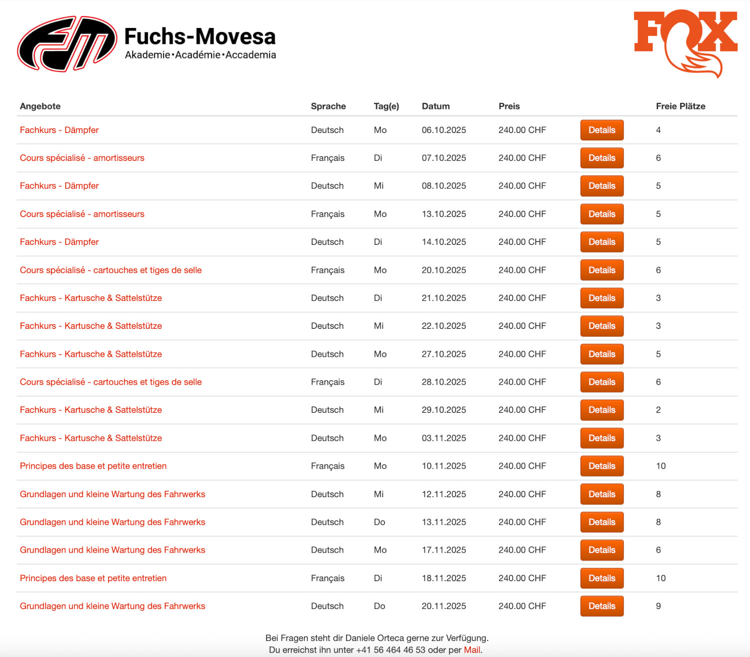 Die kostenpflichtigen Schulungen für den Fachhandel werden von der Fumo Akademie auf Deutsch und auf Französisch angeboten. Sie umfassen einen Einsteigerkurs, der die Grundlagen der Fahrwerkstechnik vermittelt und zu einer kleinen Wartung befähigt, sowie vertiefende Angebote zu Federgabeln und Federbeinen. Auch die «Transfer»-Vario-Stützen sind Teil der Kursinhalte. Das Online-Anmeldeportal mit allen Terminen zwischen 6. Oktober und 20. November ist seit vergangenem Freitag aufgeschaltet (Link). Da gewisse Vorzugskonditionen für den Fachhandel auch vom Besuch dieser Schulungen abhängen, lohnt ein solcher sich gleich doppelt.