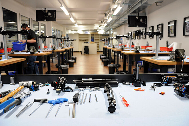 Die Elektronik hat auch bei den Fahrwerks-Komponenten und Vario-Stützen von Fox längst Einzug gehalten. Auch in Bezug auf das Innenleben der Teile hat sich einiges getan. Als Vertriebs- und Servicepartner von Fox und Marzocchi in der Schweiz hält Fuchs-Movesa die Federgabeln, Federbeine und Vario-Stützen der beiden Marken in der hauseigenen Service-Werkstatt in Schuss. Zudem zeichnet das Unternehmen für die technische Schulung des Fachhandels verantwortlich und hat mit der Fumo Akademie auch entsprechend investiert. An zwölf professionell eingerichteten Werkbänken können die wichtigsten Handgriffe erklärt und gleich nachvollzogen werden.