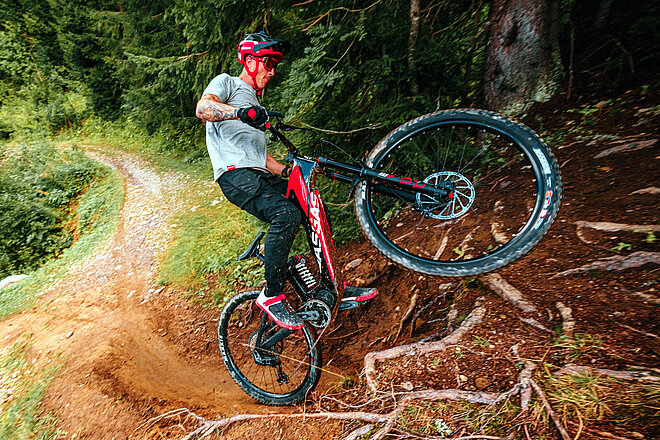 Ab Werk sind die «ECC»-Modelle als «Reverse Mullets» aufgebaut, also mit einem 29-Zoll-Laufrad vorne und einem 27.5-Zoll-Rad hinten. Eine besondere Erwähnung verdienen die Fahrwerkskomponenten an den beiden teureren Modellen «ECC6» (empfohlener Verkaufspreis CHF 9999.-) und «ECC5» (empfohlener Verkaufspreis CHF 9299.-). Von DVO und der Pierer-Tochter WP gemeinsam entwickelt, bieten diese eine getrennt einstellbare Highspeed- und Lowspeed-Dämpfung auf der Druck- wie der Zugstufe und zudem ein Blow-Off-Ventil, um mit besonders heftigen Einschlägen klar zu kommen. Beim Einstiegsmodell «ECC4» (empfohlener Verkaufspreis CHF 8299.-) stellt Rock Shox die Federelemente. Wegen dem herkömmlichen «Eagle»-Antrieb entfallen hier Zusatzfunktionen von Srams «Powertrain»-Paket wie das Schalten ohne Treten oder die Automatik-Option.