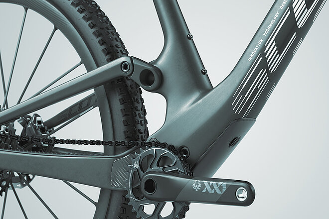 Angelenkt wird das im Rahmen steckende Federbein von einem kurzen Hebel, der auf generös bemessenen Lagern dreht. Diese Konstruktion sorgt für eine enorm aufgeräumte Optik und erlaubt es den Ingenieuren von Scott Sports, die Fahrwerkseigenschaften weiter zu verfeinern, ohne die Bikes schwerer zu machen. Dank der kurzen Hebel der IST-Kinematik werden seitliche Belastungen vom Federbein fern gehalten, und zusammen mit der enorm steifen Trunion-Aufnahme und dem Verzicht auf Drehpunkte im Hinterbau ergibt dies ein ebenso leichtes wie steifes Fahrwerk.