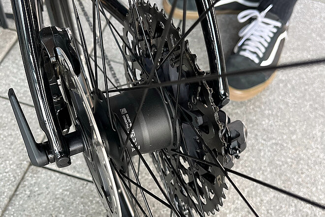 Doch das ist noch längst nicht alles. Denn die Hinterrad-Nabe weist einen auffällig grossen Durchmesser auf - weil in ihr ein Nabendynamo verbaut ist. Dieser Dynamo liefert den nötigen Strom für die elektronische Di2-Schaltung. Ein Blick zum Lenker zeigt, dass an diesem keine Schalthebel verbaut sind. Denn das «Cues Di2»-Schaltwerk legt basierend auf Tempo und Trittfrequenz jeweils automatisch den am besten passenden Gang an der Kassette auf - die «Auto Shift»-Technologie von den «Steps»-Hilfsantrieben lässt grüssen.