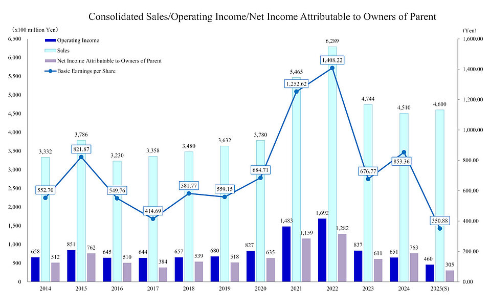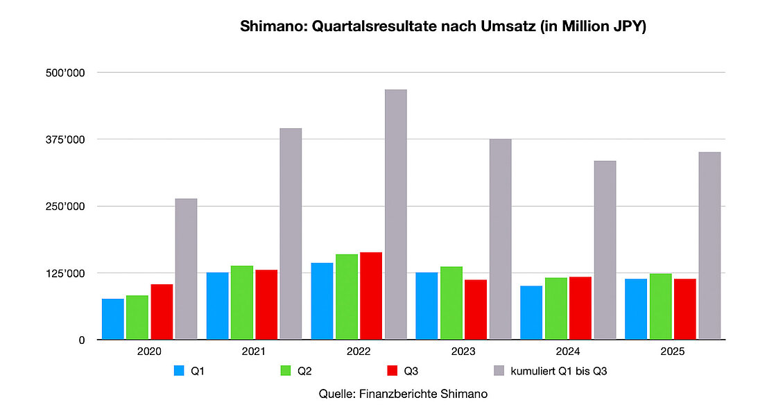 Nach den ersten neun Monaten des Jahres 2025 liegt der mit dem Verkauf von Veloteilen erzielte Umsatz mit JPY 266,24 Milliarden (CHF 1,394 Milliarden) gut 5 Prozent über dem Niveau des Vorjahrs, während der Betriebsgewinn um 27 Prozent auf JPY 30,16 Milliarden (CHF 157,94 Millionen) sank. Im dritten Quartal blieb der Umsatz zudem um über 7 Prozent unter der Vorgabe des Vorjahres.