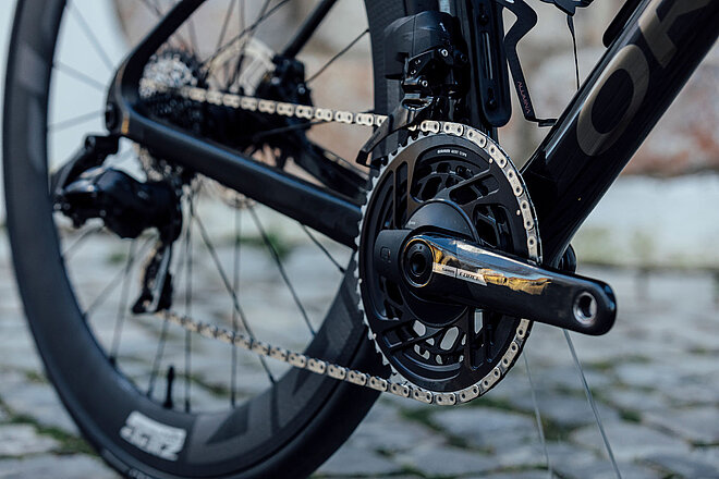 und in die Kettenblätter integrierter Leistungsmessung von Quarq.