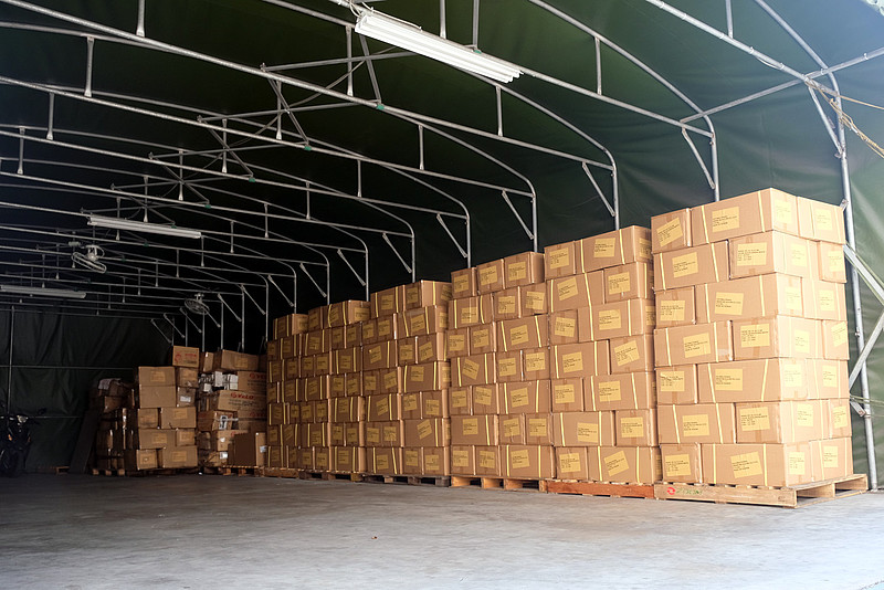 Einige Hersteller haben auf Flächen wie Parkplätzen behelfsmässig grosse Zelte aufgestellt, um fertige Handelsware auf Paletten vor UV-Strahlung und Regen geschützt zu lagern. (Foto: Laurens van Rooijen)