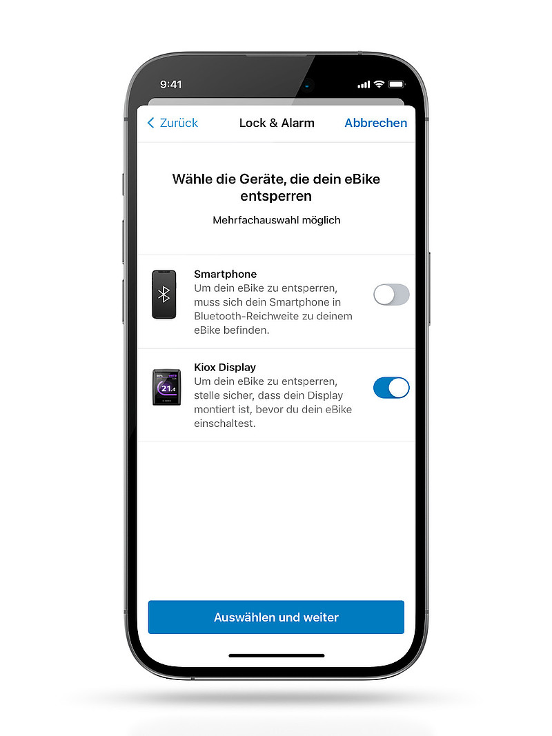 Ist das Elektrovelo eingeschaltet und das jeweilige Display verbunden, lässt sich in den Einstellungen der «eBike Flow»-App der bevorzugte Schlüssel festlegen. Dabei ist es möglich, das Smartphone, das Display oder beides als Schlüssel zu definieren.